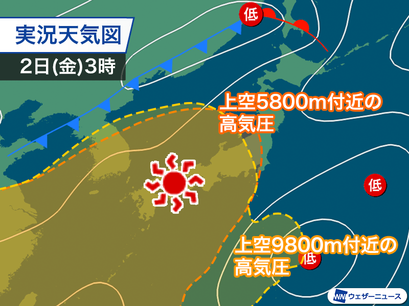 今日8月2日(金)未明の気圧配置を見ると、「太平洋高気圧」と呼ばれる上空5800m付近の高気圧は九州付近に中心があり、西日本から東日本を覆っています。さらに高い所の上空9800m付近も同様に九州付近に中心をもつ高気圧がある状況です。