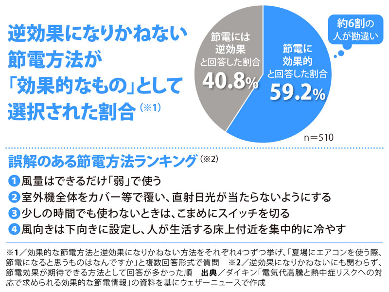 「今回の調査では、効果的なエアコンの節電方法4項目と、実際には逆効果になりかねない方法4項目を回答者に示したうえで、それらのうち『夏場にエアコンを使う際、節電になると思うものは何ですか』と複数回答形式で尋ねました。