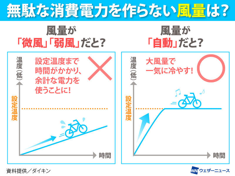 風量を抑えるとファンの回転音が小さくなりますので、消費電力が抑えられていると思われがちです。ところが、風量が少ないと室内が涼しくなるまでに時間がかかってしまい、そのぶん消費電力量が増加する場合があるのです。