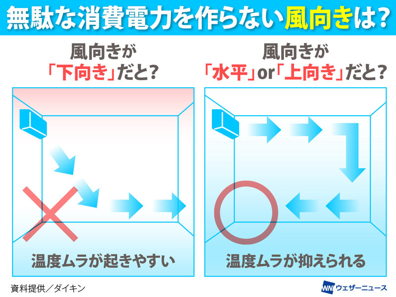 冷たい空気は重いので床方向にたまる性質があります。風向を水平にすると上から下に自然に冷気が降りて『温度ムラ』が比較的抑えられ、風が身体に直接当たる不快感も和らぎます。