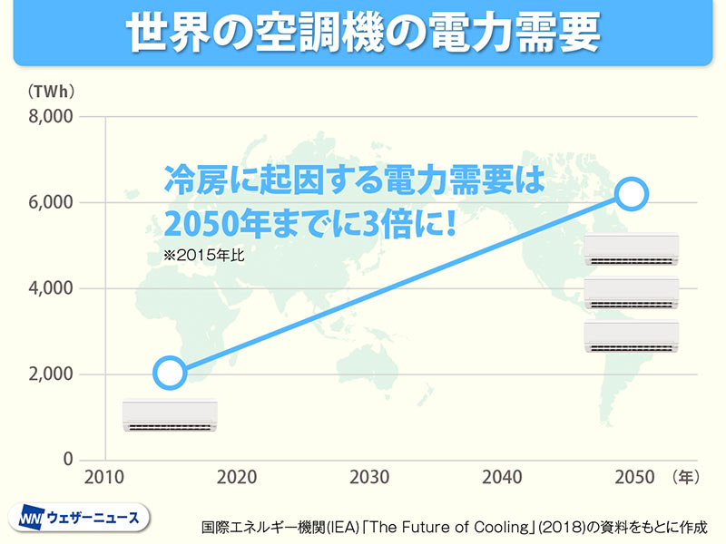 また、近年では、新興国の経済成長などによりエアコンの普及が進み、冷房の電力需要は2050年には3倍(2015年比)に達すると予想されています」(重政さん)