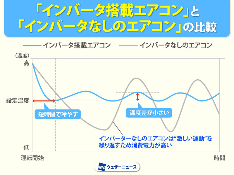 「エアコンで冷房や暖房をするときに不可欠なのが圧縮機と呼ばれる部品です。インバータは、室温に応じて圧縮機の動きをきめ細かく制御する技術です。冷房運転の場合、インバータエアコンは、室温が設定温度に達するまでは運転を強め、部屋が涼しくなったら運転を弱めて室温を維持します。そのため、快適で無駄を抑えた運転が可能です。