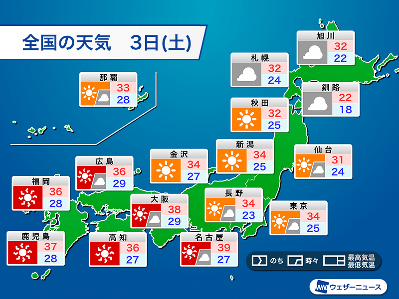 明日3日(土)は気圧配置に大きな変化がなく、高気圧の中心に近い西日本を中心に晴れて厳しい暑さが続きます。西日本から東海は軒並み35℃以上の猛暑日となり、名古屋市の最高気温は39℃、大阪市は38℃と体温を大きく上回る危険な暑さです。