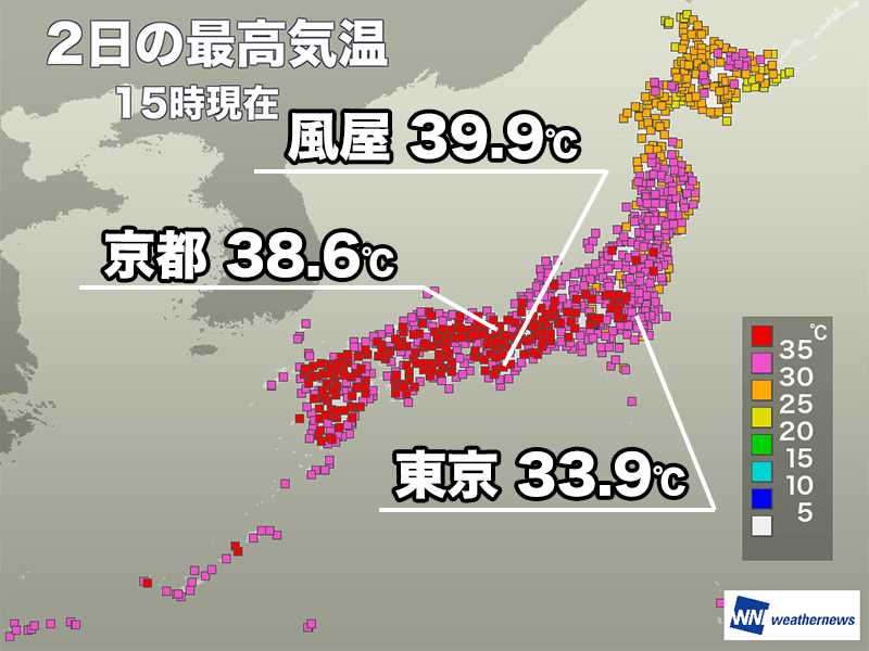 15時00分までの最高気温は全国で最も高くなった奈良県十津川村・風屋で39.9℃を観測。近畿地方では 1994年に和歌山県かつらぎ町で記録した40.6℃に次ぐ2位タイの暑さです。