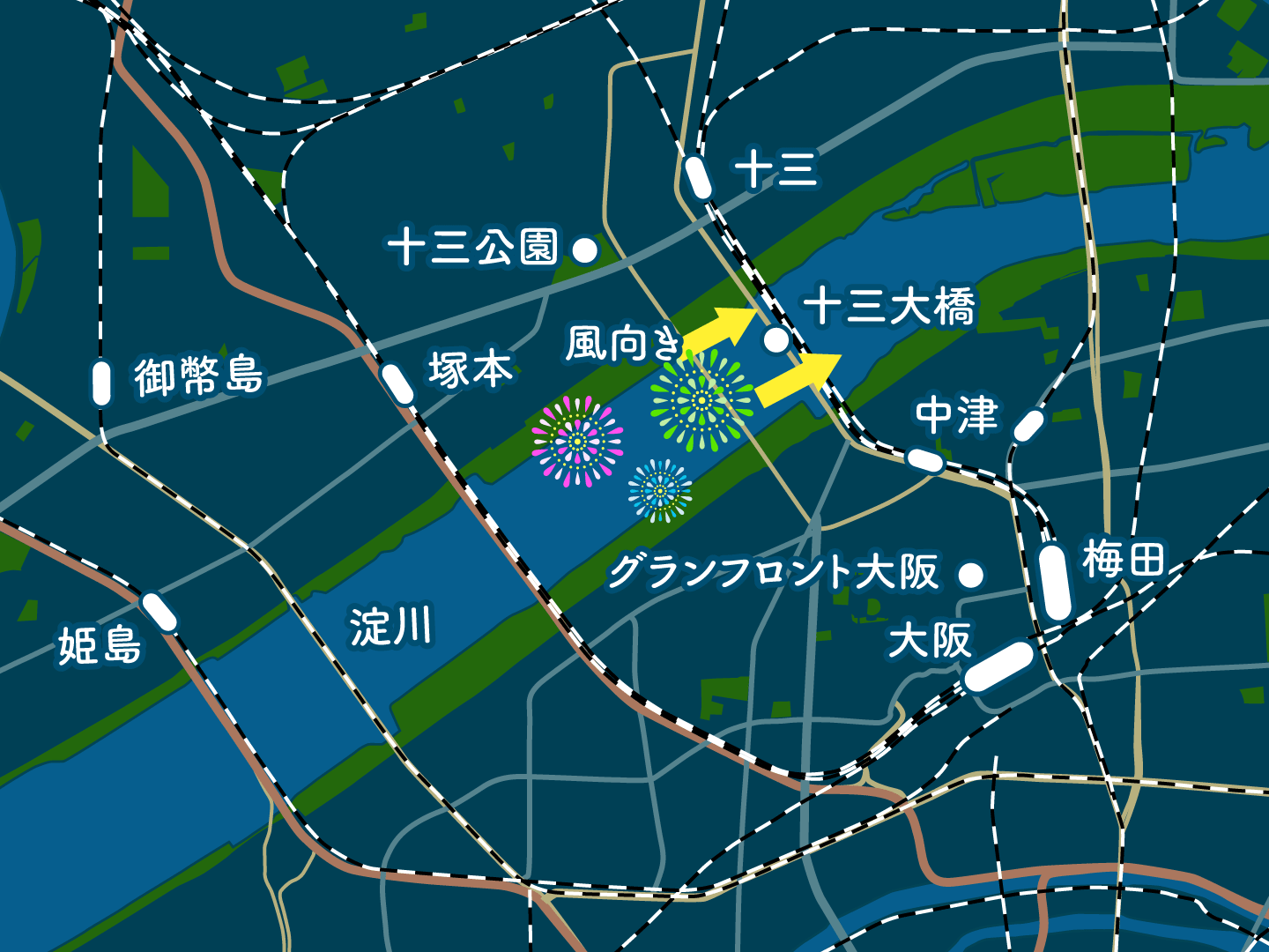 煙は十三側、西中島側へ流れる予想で、福島・野田側からの観覧には問題のない風向きといえそうです。