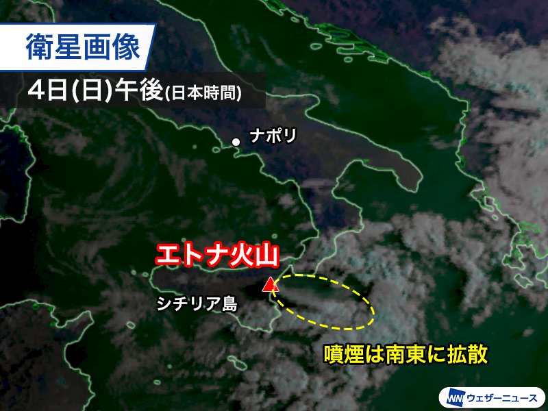 今日の噴火は日本時間の4日(日)の昼過ぎに発生し、上空10,000m以上まで噴煙が到達したとみられます。イタリア国立地球物理学火山学研究所によると、日本時間の14時30分の時点でも噴煙の噴出は継続している状況です。