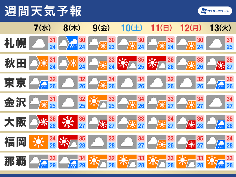 晴れていても天気が急変して局地的に雷雨となる日が続き、特に夕方〜夜間に雨雲が発達することが多い見込みです。どこでいつ雨が降るかは直前まで予測が難しいため、可能性を頭に入れて計画を立てるようにしてください。