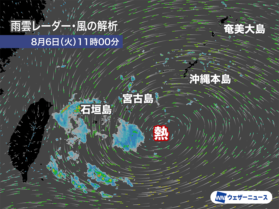 沖縄の先島諸島では未明から発達した雨雲が流れ込み、宮古島市の下地島では3時12分までの1時間に50.0mmの非常に激しい雨を観測しました。11時現在、活発な雨雲は主に海上にありますが、島内に流れ込んでくると再び強く雨が降るおそれがあります。突然強まる雨に注意してください。