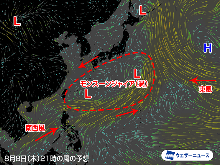 日本の南の海上では、モンスーンと呼ばれる南西からの季節風と、太平洋高気圧の縁辺を吹く東からの風が合流することで広大な低気圧(低圧部)が形成されています。この低圧部をモンスーントラフと呼び、低圧部による反時計回りの風の循環をモンスーンジャイアと呼びます。