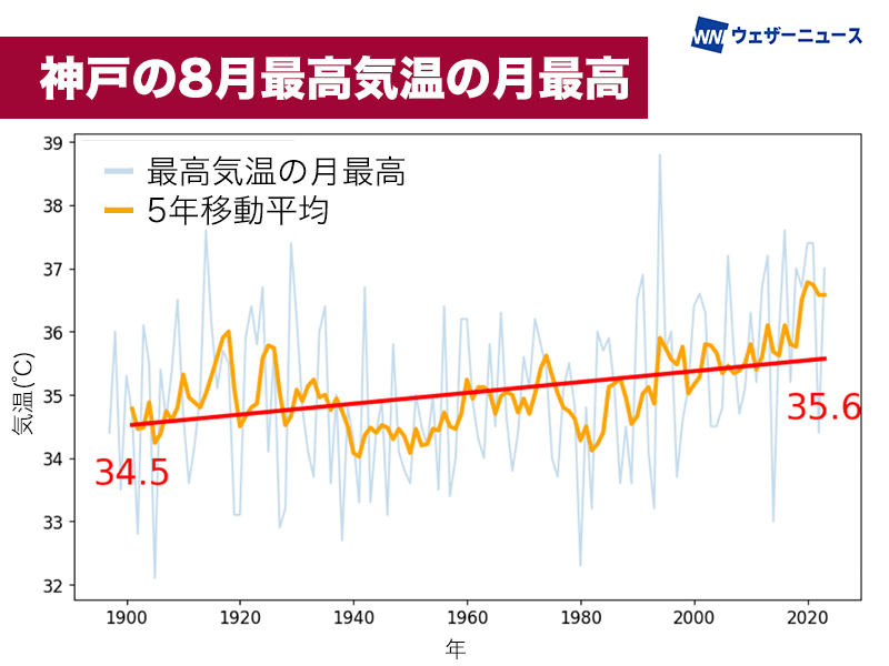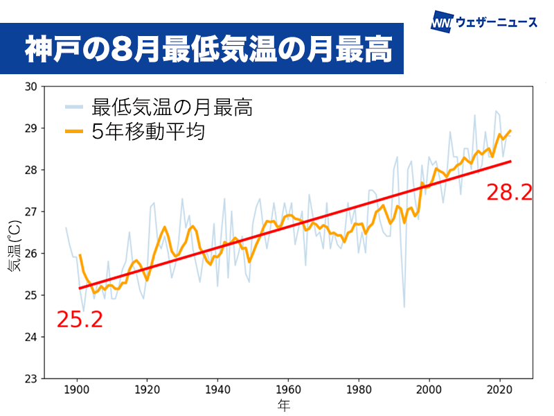 観測所の移設による影響は含まれているものの、全体としては地球温暖化と都市化によって顕著に上昇していると考えられます。今日7日(水)の神戸の最低気温は28.2℃と平年より2℃ほど高く、8時過ぎには30℃に到達しました。今年からは最も暑い時間帯の試合を避ける二部制が導入され、気候変動に対する一つの「適応」であるといえます。