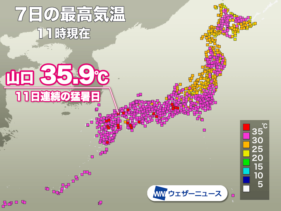 最も高い最高気温は山口、高知県中村、広島県加計の35.9℃です。山口では11日連続の猛暑日となっています。