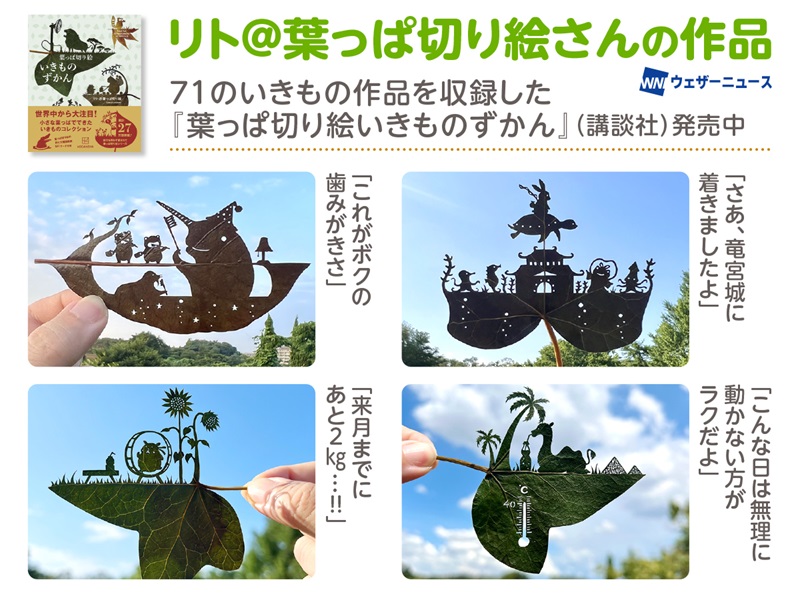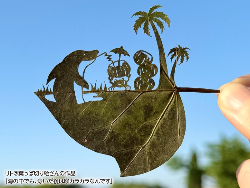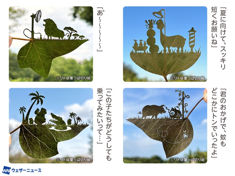 「葉っぱ切り絵をSNSに発表し始めて8か月、まったくフォロワーが伸びず、もうやめようかと思っていた頃です。投稿して、朝起きたら突然フォロワー数が4倍になっていた。背景がただの青空じゃなくて、もくもく白い雲がある夏らしい空だったから、人を惹きつける写真になったのかもしれません」(リトさん)