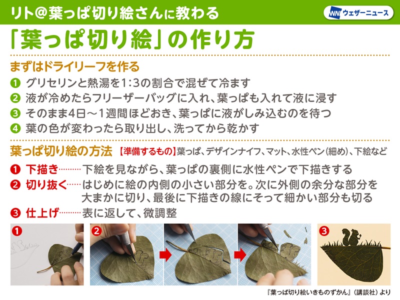 一見難しそうな葉っぱ切り絵ですが、誰でも楽しめるといいます。実際に、リトさんのイベントには子どもも多く参加しているといいます。