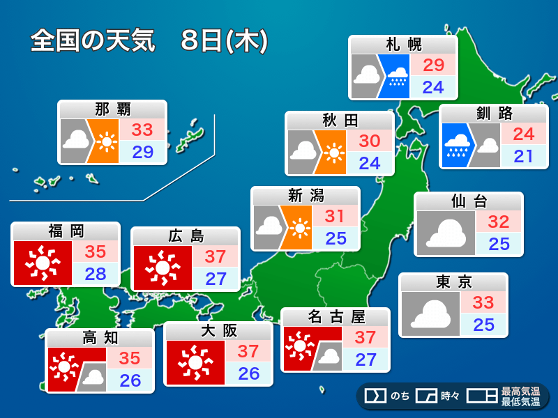 明日8日(木)も東海や西日本では強い日差しが照り付けて体温を上回るような危険な暑さが続きます。予想最高気温は名古屋や大阪で37℃、佐賀で39℃です。