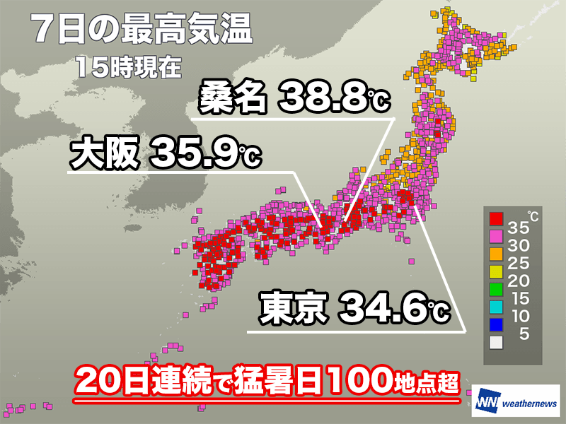 猛暑日地点は20日連続で100超
