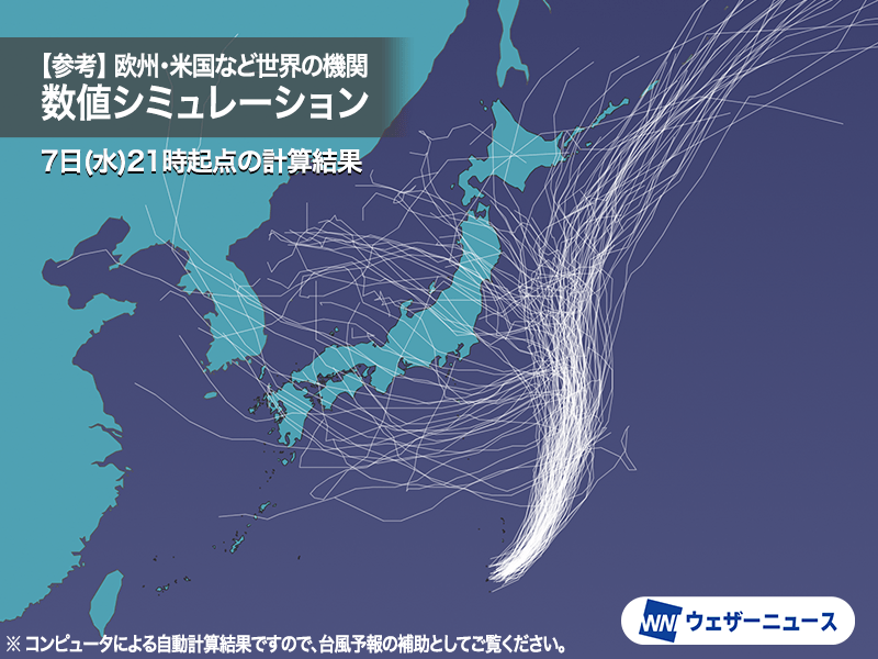 これらを比較すると、日本の東に北上する傾向は概ね揃っているものの、その先で北東に離れる予測と本州方面に向かう予測でばらつきがあることがわかります。