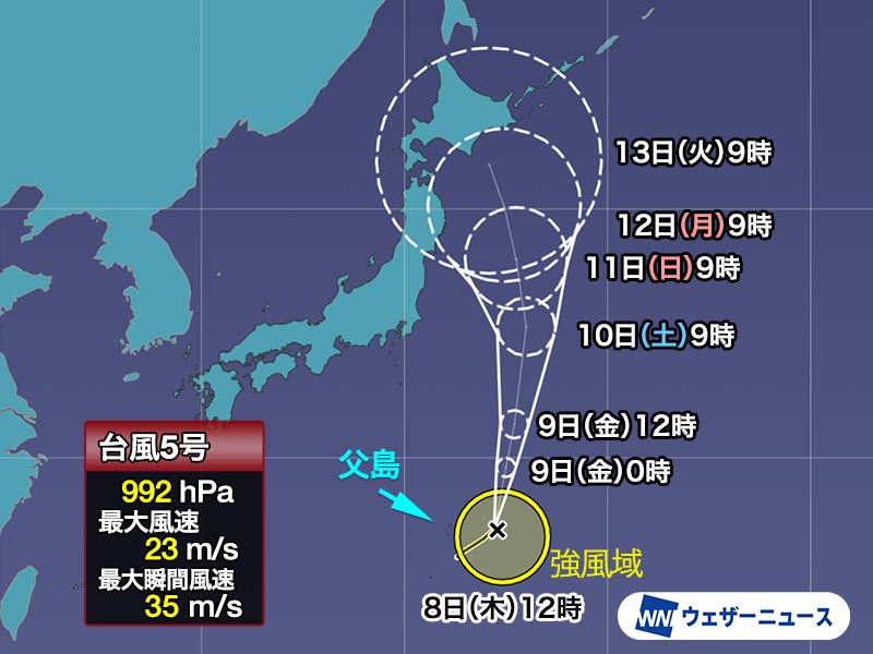 台風5号(マリア)が小笠原近海にあって北上をしています。今後も北上を続け、三連休には日本の東に到達する見込みです。その後の進路の確度はかなり低くなっていて、本州方面にも影響が及ぶ可能性も否定はできません。