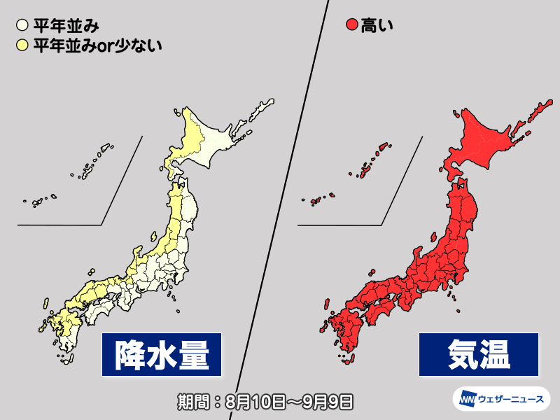 太平洋高気圧は日本の東から南への張り出しが強まり、日本列島を南から覆う形になります。日本付近は暖かな空気に覆われやすくなり、1か月の平均気温は全国的に平年よりも高い予想です。