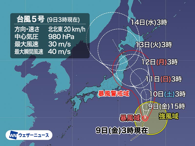 台風5号(マリア)が小笠原近海にあって北上をしています。今後も北上を続け、三連休には日本の東に到達する見込みです。その後の進路については大きな幅があり、12日(月)以降は台風進路の予報円が大きくなっています。