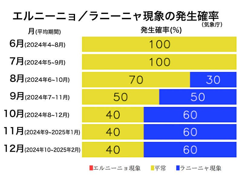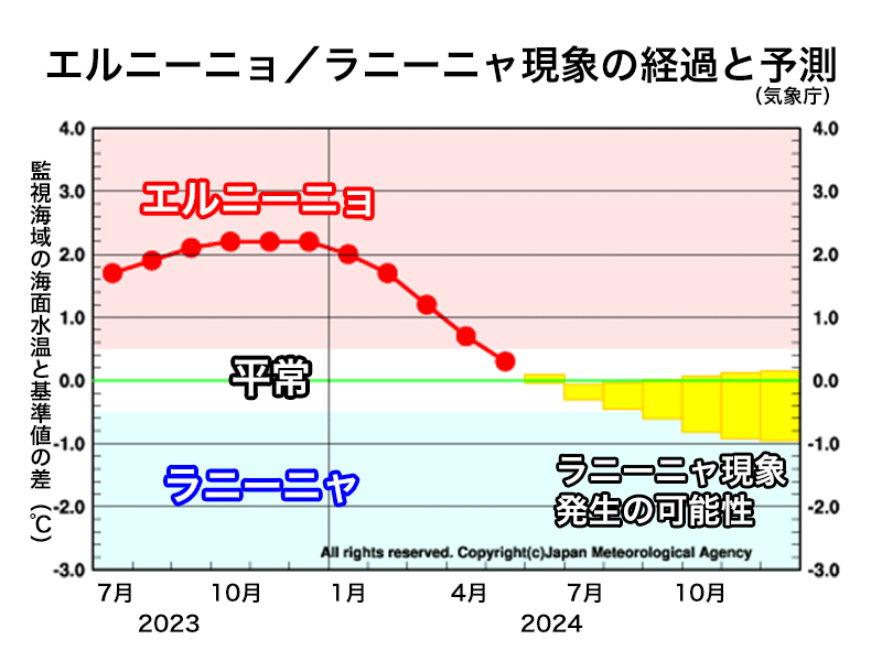 また、エルニーニョ現象発生の判断に使用している5か月移動平均値の5月の値は+0.3℃となり、2023年春から続いていたエルニーニョ現象は、2024年春に終息したことが確定しました。