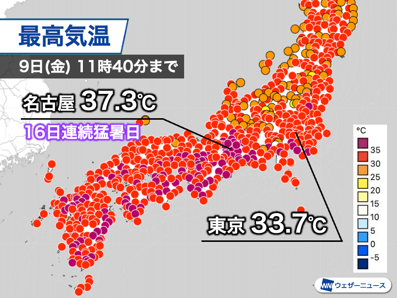 11時40分までの最高気温の分布を見ると、特に東海西部から西日本で35℃以上の地点が目立ちます。名古屋市は10時台前半に35℃を突破し、16日連続の猛暑日となりました。11時37分には37.3℃を観測し、体温並みの耐え難い暑さになっています。