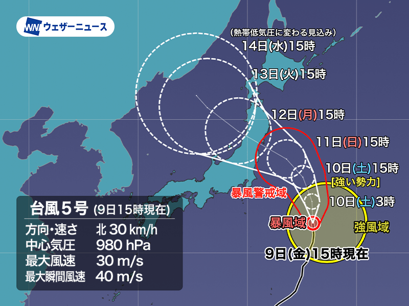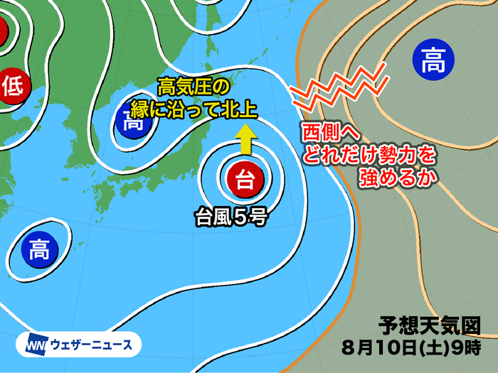 台風5号は明日10日(土)にかけて暖かい海域を北上するとみられ、加えて台風の南側からは水蒸気の供給が続くため、さらに発達して一時的に強い勢力となる見込みです。その後11日(日)は進路を徐々に西寄りに変え、水蒸気の供給が弱まって勢力を落とすとみられます。