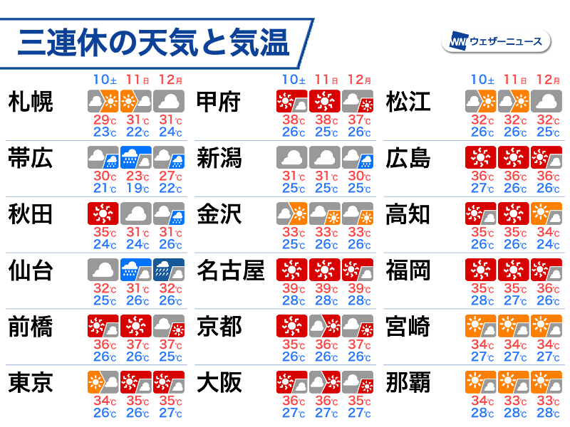名古屋市は三日とも最高気温が39℃と、体温を大きく上回る危険な暑さを予想しています。大阪市や広島市、福岡市も連日の猛暑日となるため、万全な熱中症対策が欠かせません。連休を利用してレジャーを楽しまれる場合は、炎天下に長時間居ることを避け、体調を最優先するようにしてください。