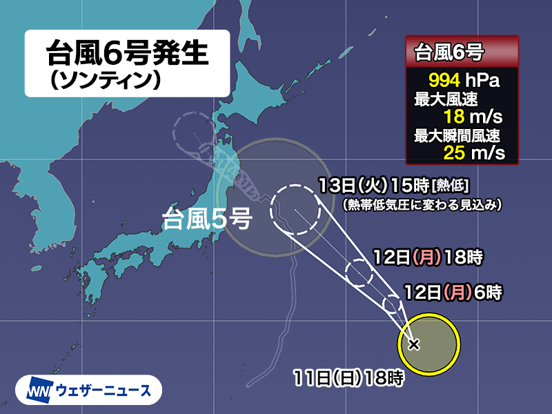 台風6号は顕著な発達は予想されておらず、三連休明けまでには勢力を落として再び熱帯低気圧になる予想となっています。
