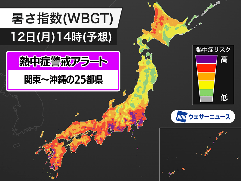明日8月12日(月)対象の熱中症警戒アラート 関東以西の22都県