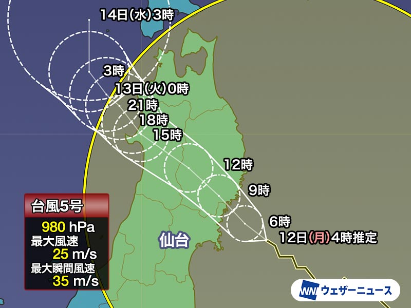 台風5号は12日(月)の午前中に岩手県〜宮城県に上陸する見込みです。