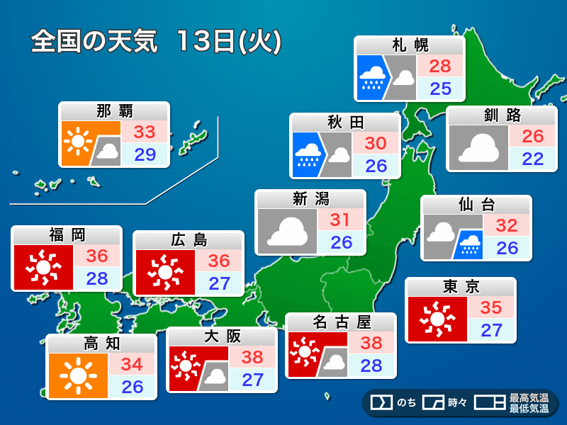 明日13日(火)も関東から西日本は、太平洋側を中心に強い日差しが照りつけます。最高気温は35℃以上の猛暑日の所が多く、最大限の熱中症対策が欠かせません。暑さが続いているため、夏バテにもお気をつけください。