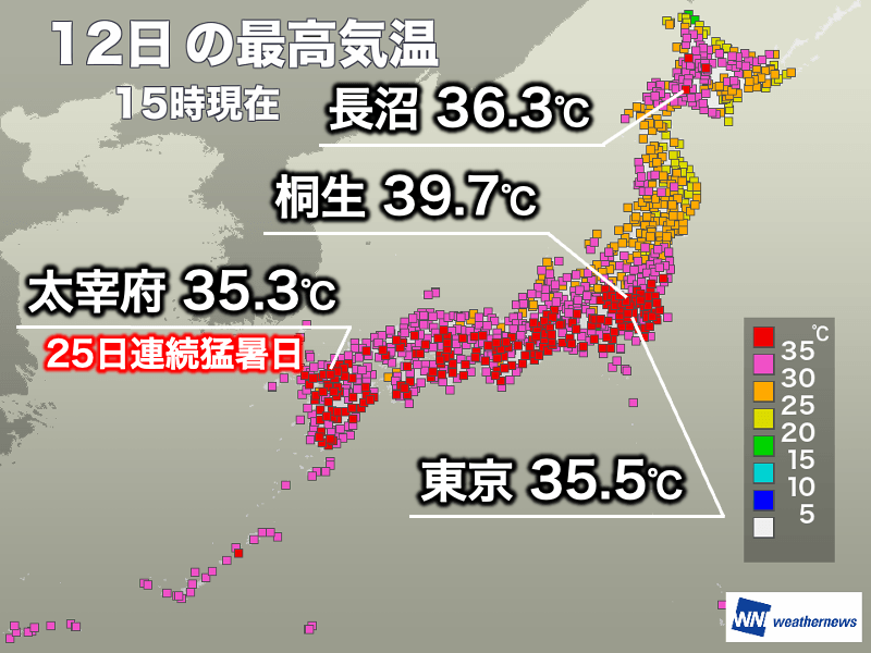 また、福岡県太宰府市と熊本県甲佐町、兵庫県淡路市郡家では7月19日から25日連続の猛暑日です。全国の猛暑日連続記録を更新しています。