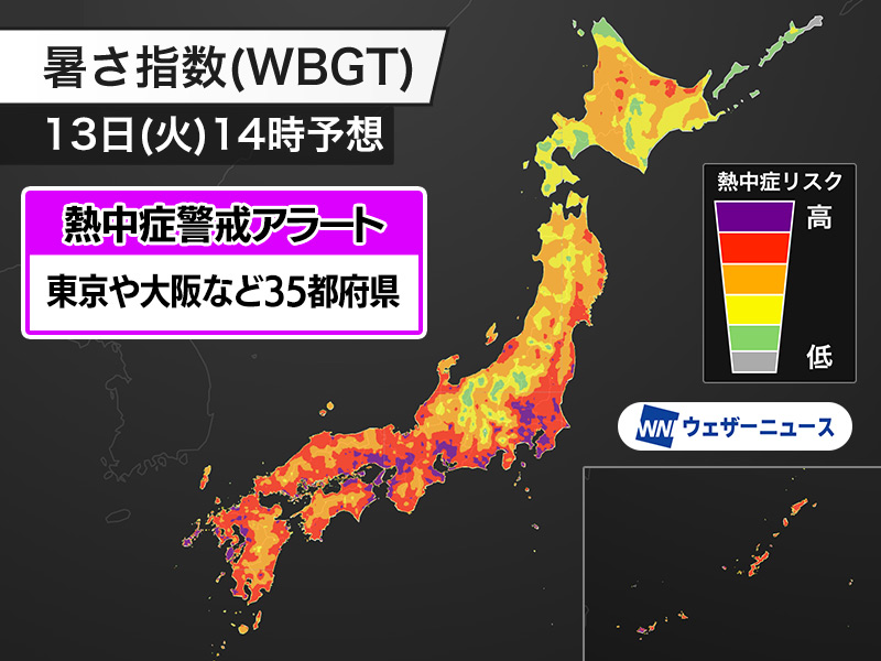 今日8月13日(火)対象の熱中症警戒アラート 東京や大阪など35都府県