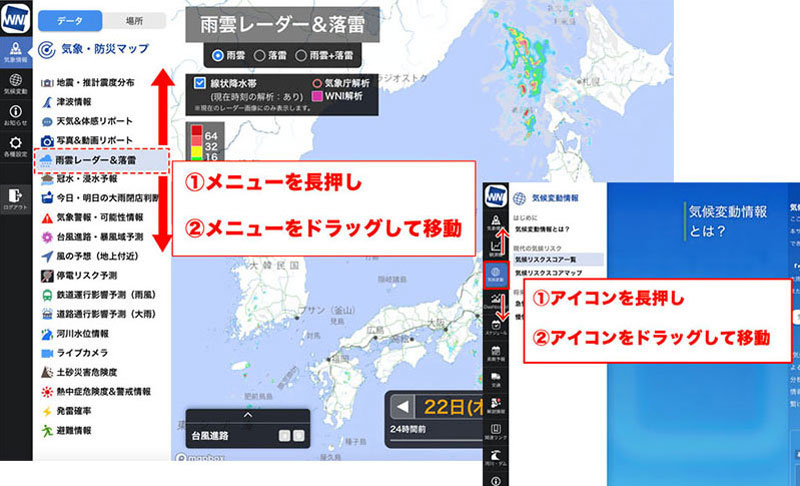 並べ替えたい気象情報メニューや黒帯内のアイコンを長押しすると、メニューの背景が水色の選択状態になります。
