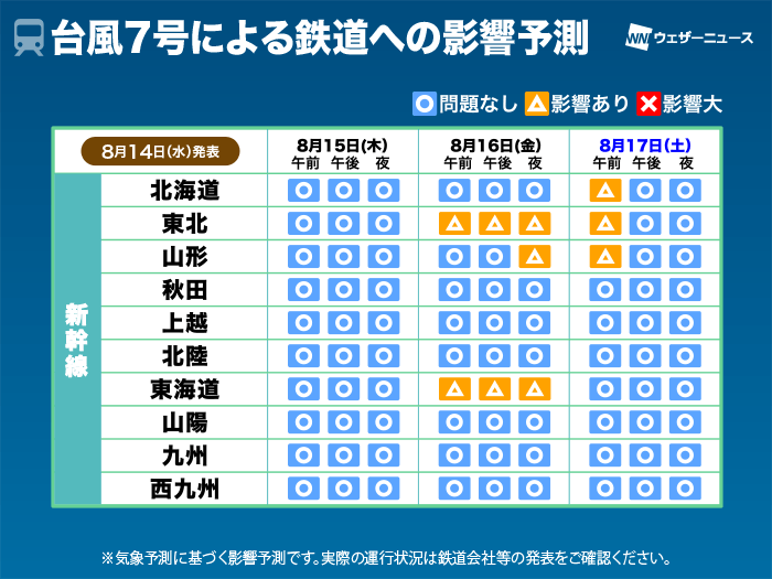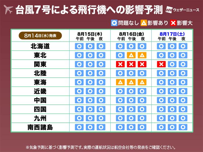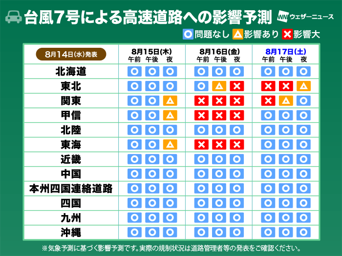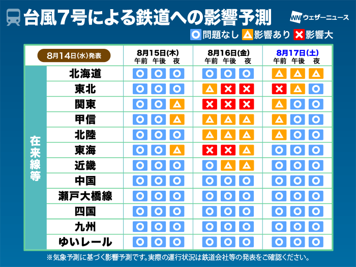 台風7号 交通影響予測 お盆休みUターン時に関東を中心に影響大(14日13時更新)