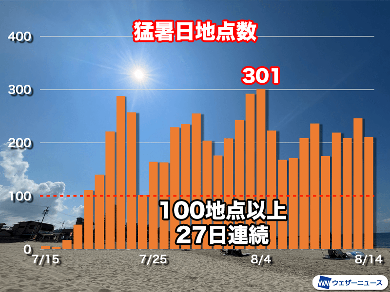 前述のように福岡県太宰府市などは27日連続猛暑日と過去の国内最長を更新しています。また、猛暑日地点が100を超える日も7月19日から継続していて、8月4日には現在と同じ統計方法になった2010年以降で最多となる301地点を記録しました。
