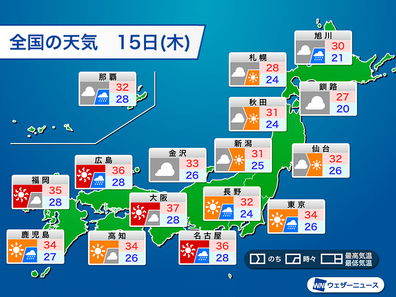 それでも最高気温は大阪市で37℃、名古屋市や広島市で36℃など西日本から東海を中心に猛暑日の所が多く、厳しい暑さには変わりがありません。東京都心や鹿児島市も34℃まで上がる見込みです。