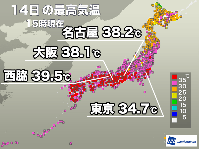 今日14日(水)も西日本や東海で猛烈な暑さが続いています。特に近畿で気温の上昇が目立ち、一部では39℃台の危険な暑さになりました。