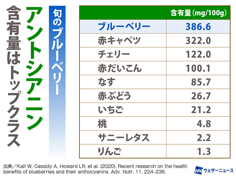 ブルーベリーといえばアントシアニンと認識されるほど、多く含まれていることが知られています。アントシアニンを含む他の身近な野菜や果物と比べても、100gあたりの含有量が非常に多いことがわかります」(吉田さん)