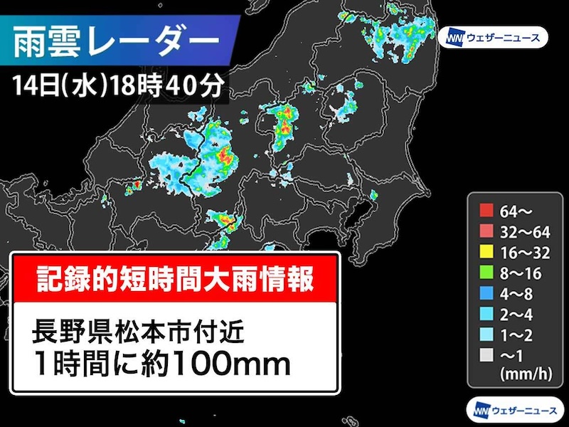 長野県で1時間に約100mmの猛烈な雨 記録的短時間大雨情報