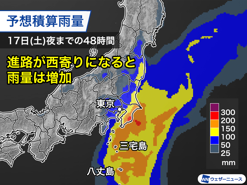 また、台風本体の発達した雨雲や周辺の多量の湿った空気によって、1時間に50mmを超える非常に激しい雨が降り、24時間降水量は200mmを超える大雨のおそれがあります。台風の進路が西寄りになると、東京都内なども雨量が増加します。