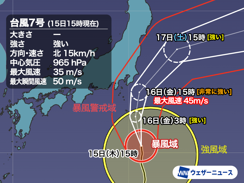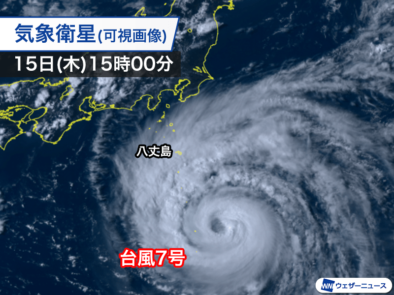 8月15日(木)15時現在、強い勢力の台風7号(アンピル)は、伊豆諸島・八丈島の南南東の海上を北に進んでいます。