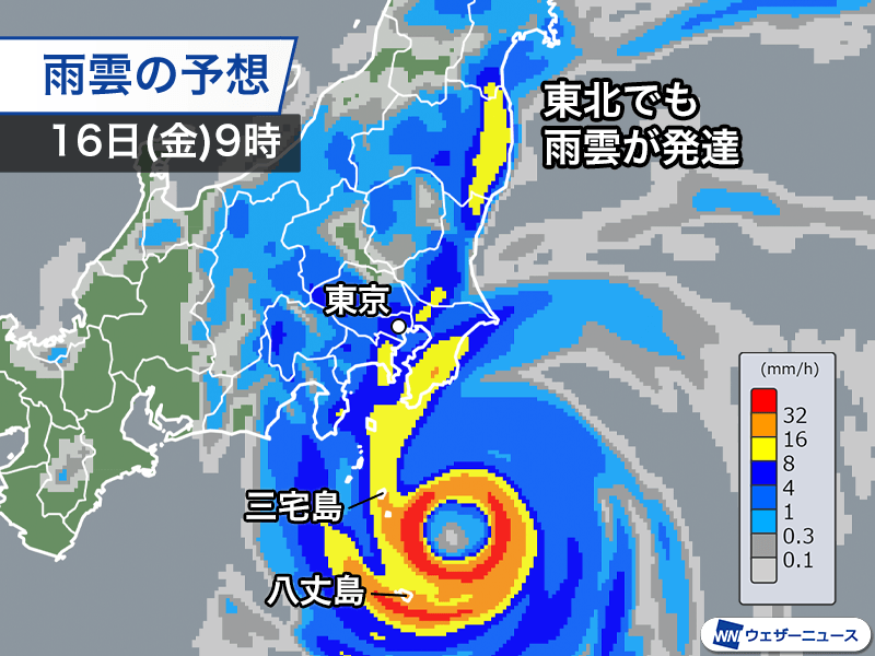 台風の周囲を取り巻く雨雲は、伊豆諸島南部にかかり始めています。今夜遅くには関東の南部沿岸に広がり、次第に雨が降り出す見込みです。