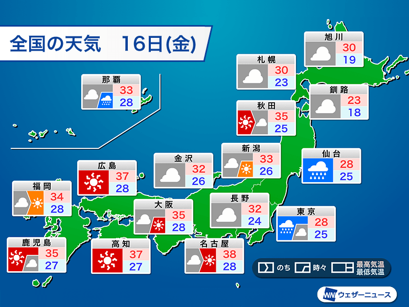 台風の影響がなく晴天が続く西日本と東海は猛暑が継続し、各地で猛暑日となります。北寄りの風が吹くため山越えとなる太平洋側を中心に気温が上がりやすく、名古屋市で38℃、高知市で37℃の予想です。