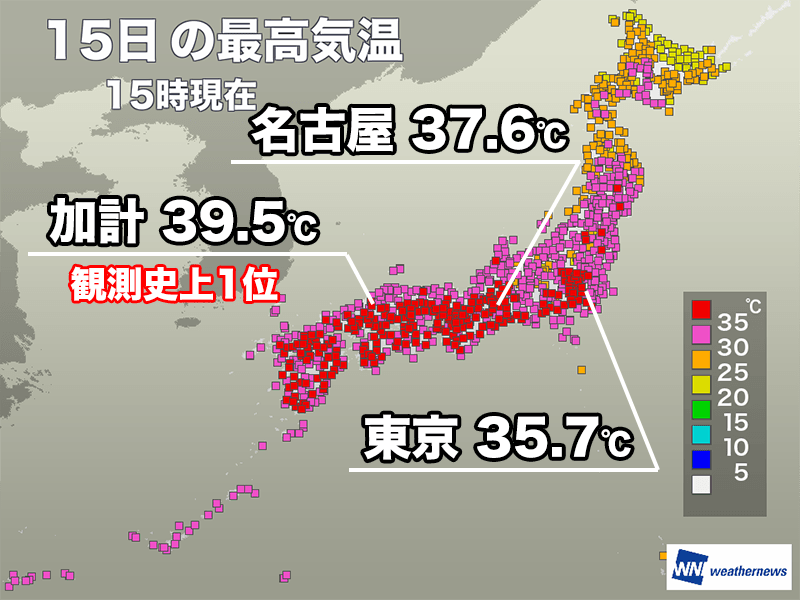 15時00分までの最高気温が全国で最も上がった広島県安芸太田町・加計は39.5℃を観測。今月3日に記録した観測史上最高をまた更新しました。そのほか、大阪府堺市で39.2℃、山口市で38.6℃、岐阜市で38.5℃など体温を大きく上回る38℃以上の所が目立っています。