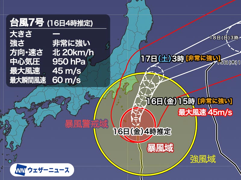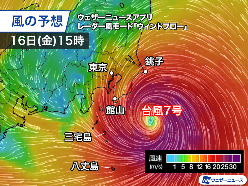 このため、台風が陸地に近づいても衰えず、16日(金)午後以降も中心付近の最大風速は45m/sと、非常に強い勢力で関東に最接近する予想です。