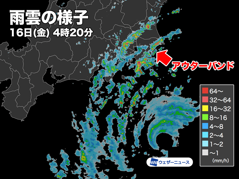 昨夜からアウターバンドが関東にかかり始めました。千葉県・勝浦(かつうら)では、4時10分までの1時間に16.0mmのやや強い雨を観測しました。