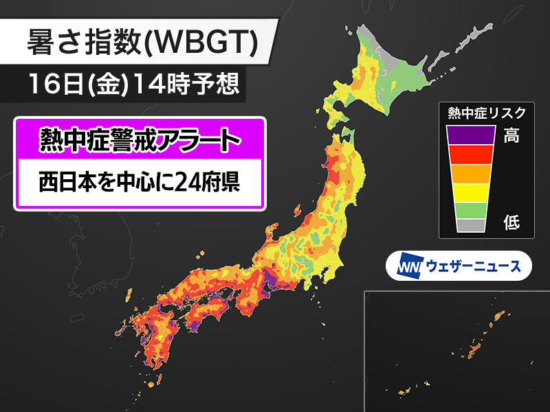 今日8月16日(金)対象の熱中症警戒アラート 西日本を中心に24府県