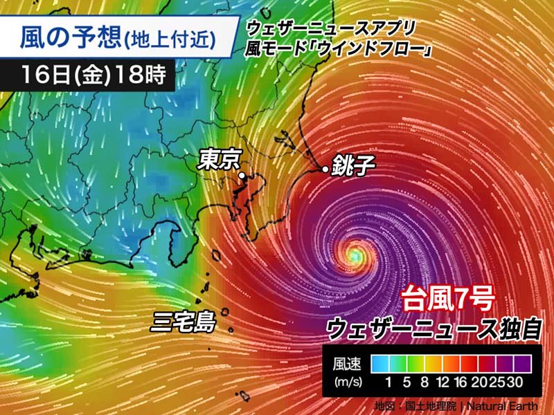 台風7号は非常に強い勢力を保ったまま千葉県の沖を北上しています。風の非常に強い領域は中心の比較的近い所に集中していて、瞬間風速が30m/sを超えるような暴風の危険性が高いのは、房総半島の太平洋沿岸に限られる見込みです。勝浦市や銚子市など台風の進路に近い地域では厳重に警戒をしてください。
