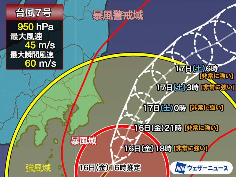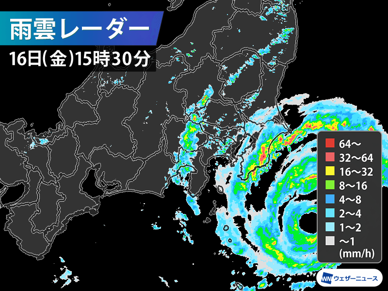 このため、台風が陸地に近づいても衰えず、関東のすぐ東側を通る際も中心付近の最大風速は45m/sと非常に強い勢力で、今日の夕方〜夜に最も接近する予想です。